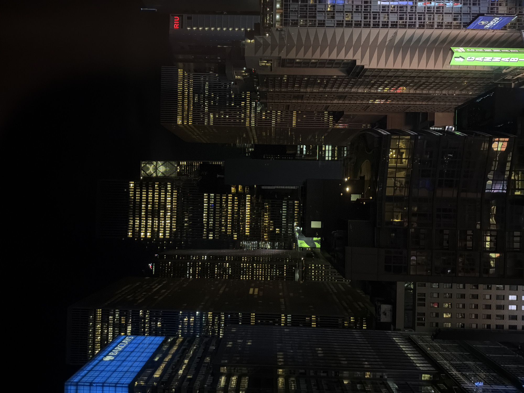 n aerial view of various high-rise buildings illuminated at night. The buildings are situated in New York City, United States of America. Some notable features include the "RIU" signage on one building, the blue "BARCLAYS" sign on another, and a large green sign on the top of the tall building. Many windows in the buildings are lit, suggesting activity within. The overall environment is dark, with the lights of the city providing the primary source of illumination.