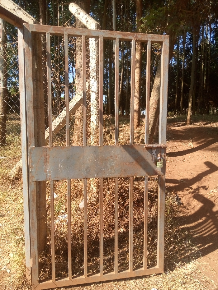 A rusty metal gate stands slightly ajar in a grassy, wooded area. The gate has vertical bars with a horizontal plate across the middle and a padlock. Behind it, tall trees cast shadows on the ground. A section of chain-link fence and a weathered wooden post are visible on the left. The ground is covered in dirt and grass.