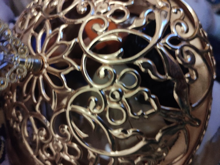 An ornate, golden object with intricate, swirling patterns dominates the frame