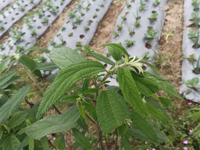 This image depicts a close-up of a leafy green plant in the foreground, characterized by textured, serrated leaves and lighter green, nascent growth at its apex
