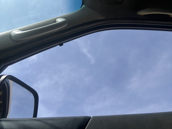 - "An upward-angled view from inside a vehicle displays a predominantly clear blue sky featuring sparse, wispy white clouds" by FM-G8jpM2, licensed under CC BY 4.0