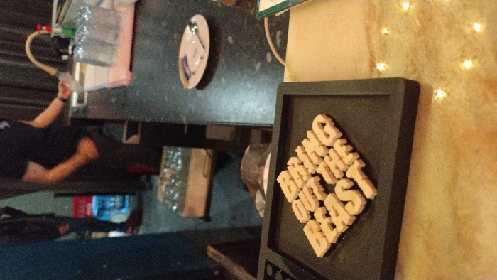The image depicts an indoor establishment, likely a cafe or bar, located in Varna, Bulgaria. In the immediate foreground, a black rectangular tray rests on a light brown, reflective surface. The tray contains light-colored, block-style letters spelling "BRING OUT THE BEST" arranged in three rows. To the right of the tray, on a dark countertop, an oval white plate holds a metal spoon and fork. Further right on the countertop, a pink plastic draining rack contains several clear glasses. Behind the draining rack, a yellow flexible hose with a red nozzle is visible. In the mid-background, behind the dark countertop, two individuals are partially visible. On the right, a person with dark hair, wearing a dark short-sleeved shirt, stands facing left, with their left hand in or near their pocket and their right arm resting on the counter. Further to the left and rear, a second person is partially visible, wearing dark trousers, possibly jeans, with a torn section near the knee. Behind this person's legs, a red crate-like object and a clear blue water bottle are visible on a dark floor. The background walls or partitions are dark and textured. The overall lighting is dim.