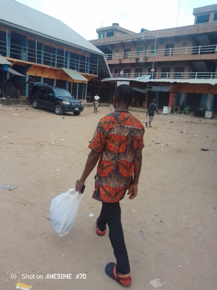 The image depicts an outdoor scene in Fegge, Nigeria, characterized by an unpaved, light brown dirt ground with scattered debris. In the foreground, an adult male, seen from behind, walks from left to right across the frame. He is wearing a short-sleeved shirt with an orange, red, and black geometric pattern, dark trousers, and red clogs. He holds a white plastic bag in his left hand and a dark-colored smartphone in his right hand. In the midground, to the left, a dark-colored SUV, possibly a Toyota Sequoia, is parked, facing towards the left. Behind the vehicle is a two-story building with a light-colored corrugated metal roof. The ground floor features multiple stalls with orange awnings, and the upper floor has blue railings or window frames. An individual is partially visible near the parked SUV. Towards the right midground, a multi-story brown building with white balcony railings is visible, with laundry hanging on some balconies. In front of this building are several makeshift market stalls or structures. Two other individuals are present: one wearing light-colored clothing is standing further left, and another, wearing a dark top and patterned trousers, is walking away from the camera towards the right. The sky is overcast.