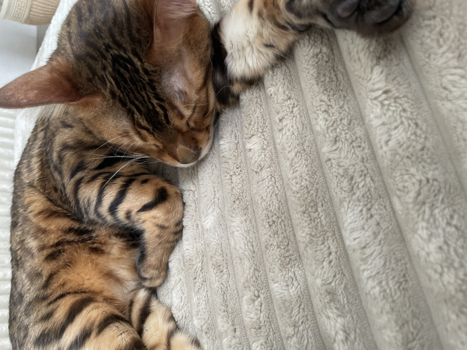- "A Bengal cat, exhibiting brown and black marbled fur patterns, is observed resting on a light beige, horizontally ribbed, plush fabric surface, likely a blanket or bedding" by FM-NoKcg2, licensed under CC BY 4.0