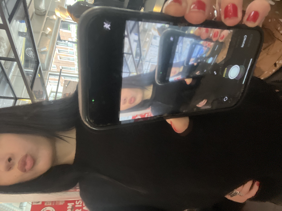 The image depicts a close-up indoor scene where a person is capturing a selfie using a smartphone. The subject, identifiable by long dark hair, a black long-sleeved top, and red nail polish on the visible right hand, holds a black smartphone (likely an iPhone) in selfie mode. The subject's lips are pursed. The phone's screen displays a recursive reflection of the person holding the phone and the phone's screen itself, alongside the active camera interface showing the current view. A silver-toned ring is visible on the middle finger of the subject's left hand. The background reveals a modern commercial interior, likely a retail store. Features include a dark, grid-like ceiling structure with track lighting fixtures. To the right, a headless mannequin wearing a light-colored hat is partially visible. On the far left, a red and white sign with partially legible text, "FROM OUR IS," is present. Large windows frame the outdoor environment, showcasing typical London urban architecture: multi-story brick buildings with numerous windows, suggesting either residential or older commercial properties across a street. The location is an indoor commercial establishment, consistent with a retail store, situated on an urban street in London, United Kingdom. Due to a lack of specific landmarks or fully decipherable signage, a precise street or neighborhood cannot be determined from the visible details.