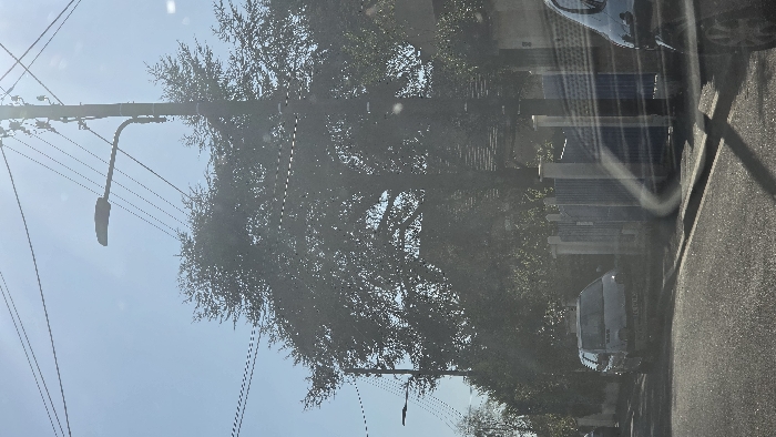The image depicts a daytime street scene in Orsay, France, viewed from inside a vehicle, evidenced by streaks and reflections on a windshield in the lower right foreground. The upper portion of the frame shows a clear, bright blue sky traversed by numerous dark utility lines. A prominent black utility pole with an attached street lamp extends from the right, and another, less distinct street lamp is visible further back on the left. A large, dense deciduous tree occupies the central background, its foliage dark against the bright sky, partially obscuring structures behind it. Along the left side of the asphalt road, a grey compact car, identifiable as a Renault Twingo with a French license plate (e.g., "AM-302-AD"), is parked facing the viewer. Behind the parked car, a residential property is delineated by a white and blue segmented fence and gate, with additional foliage and the faint outline of a building visible beyond. The asphalt road surface occupies the lower half of the frame, bordered by a curb and sidewalk on the right. Strong sunlight from the upper right creates bright conditions and casts shadows, notably from the primary utility pole and possibly the observer's vehicle, onto the road. No individuals are visible in the scene, and no specific actions or interactions are taking place.