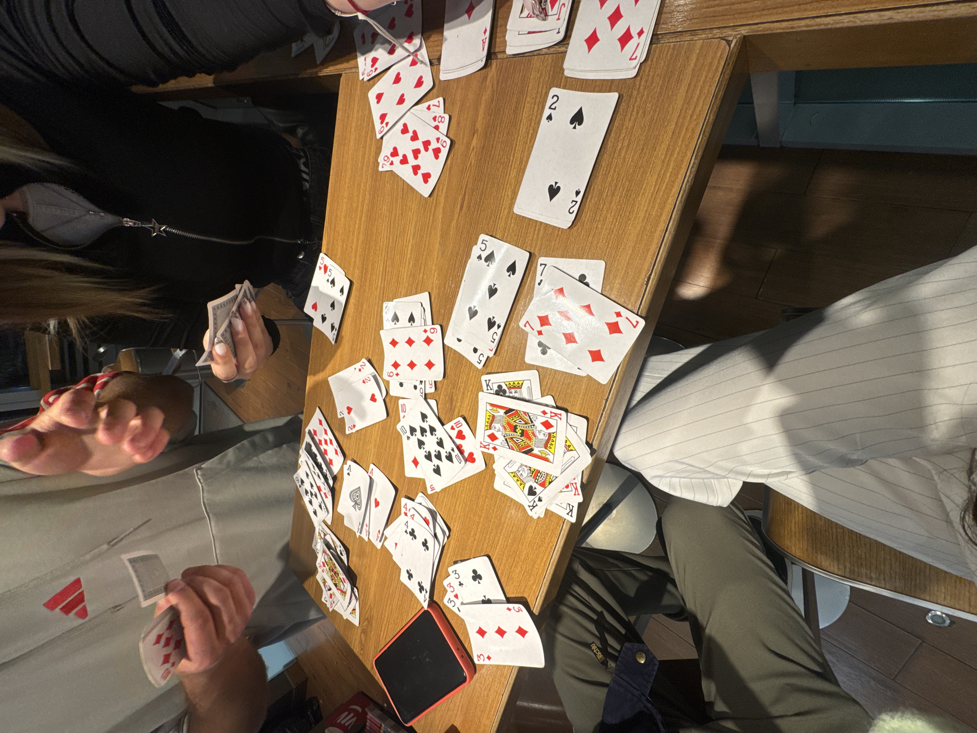 This image captures a group of people gathered around a wooden table, engaged in a card game