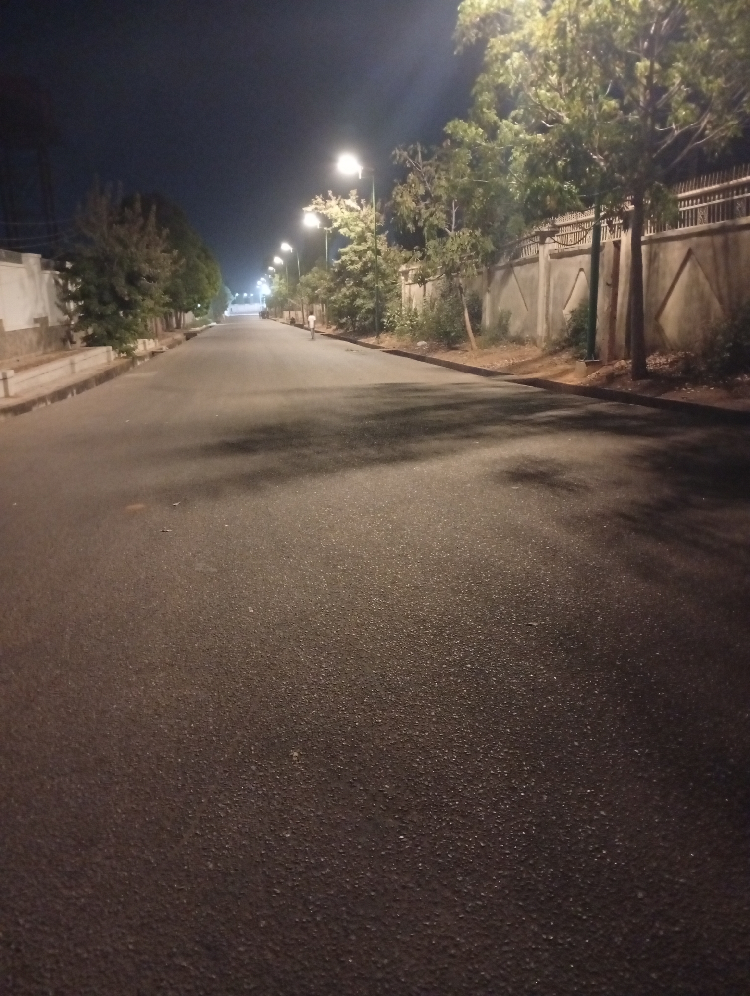 The image depicts a nighttime scene on a paved asphalt road in Gombe, Nigeria. The road, which appears clean and extends linearly into the background, is illuminated by a series of streetlights spaced along both sides, casting yellowish-white light and distinct shadows. The sky above is dark. On the left side of the road, a low, light-colored structure or wall is visible in the foreground, adjacent to a concrete curb, followed by a line of trees and vegetation. On the right side, a tall concrete perimeter wall with decorative geometric patterns and a metal fence on its upper edge runs parallel to the road, partially obscured by numerous trees and shrubs. A single individual, wearing a light-colored shirt, is observed walking away from the camera on the right side of the road in the mid-distance. No other persons or vehicles are present.