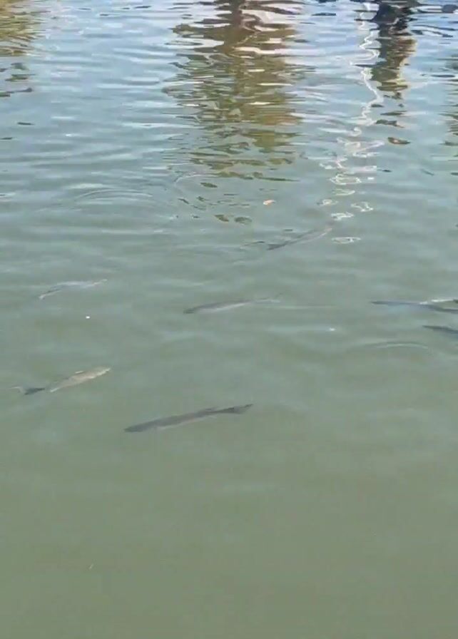 body of water, possibly a pond or lake, with a number of fish swimming in it. The water is slightly murky and reflects the sky and some trees. The fish appear to be moving slowly and near the surface. There are no people clearly visible, but the reflection suggests someone might be standing nearby.