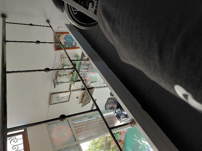 An interior scene within a residence in Mohammedia, Morocco, is captured from an elevated, downward perspective. In the immediate foreground, the upper right thigh and bent knee of an individual are visible, clad in dark grey athletic pants featuring a white, stylized logo on the outer side. The surface beneath the leg is a dark, textured floor. To the far right, a partial view of a black and chrome exercise machine flywheel is present. A dark metal banister with decorative spherical elements extends from the top left corner, running along the edge of the elevated platform, supported by a solid white railing base. Below this railing, on a lower level, a white wall displays several items. Multiple silver-colored trophies are arranged on two clear glass shelves. Below the trophies, various framed pictures or documents are mounted. To the upper left of the window, a large framed poster or artwork depicts a crest with red and green elements. To the right of the trophies, a brown-framed picture, possibly a portrait of an individual in a blue suit, is visible. A large window or glass door on the lower level provides a view of the exterior environment. Through this opening, a swimming pool with turquoise-colored water is clearly visible, along with green foliage from outdoor plants or trees. A black mesh office chair is also partially visible through the window. The interior space appears well-lit by natural light, suggesting daytime.