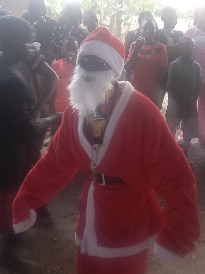 A person dressed as Santa Claus stands in front of a crowd. The Santa suit is red with white trim, complete with a black belt, and a red and white hat. A fake white beard and sunglasses obscure the individual's face. People of varying ages are standing in the background, some wearing colorful clothing. The setting appears to be outdoors, with natural lighting.