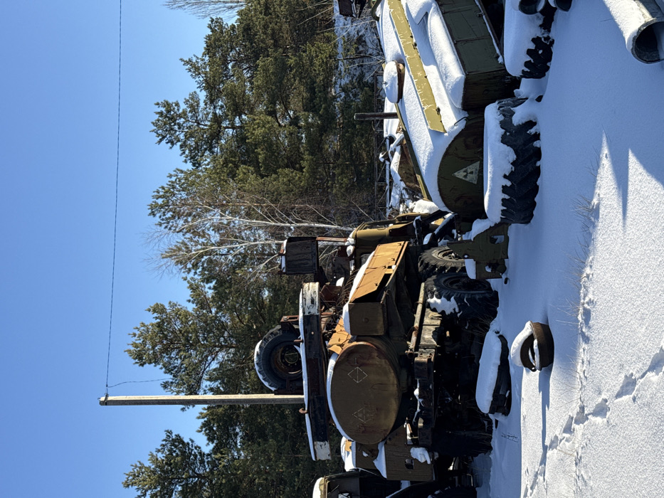 The scene depicts an outdoor vehicle graveyard or dismantling site during winter, located in Unknown, Ukraine. The ground is uniformly covered in snow, displaying distinct footprints in the foreground. Overhead, a clear blue sky is visible. In the mid-ground left, a large, heavily rusted, yellow-orange truck-like vehicle is prominent. It features a cylindrical tank mounted on its chassis, with a spare tire positioned on top of the vehicle's cab structure. Faded geometric markings are discernible on the side of the tank. To the right of this vehicle, partially obscured by snow, lies a large, olive-green tank-like structure. This object prominently displays a yellow triangular radiation hazard symbol on its side. Various other discarded mechanical components, including tires and metal debris, are strewn across the snow-covered landscape. A tall, weathered wooden utility pole, equipped with a single wire, stands vertically on the left side of the frame. The background is composed of a dense forest, primarily consisting of evergreen pine trees, interspersed with some leafless deciduous trees. No individuals are present in the image.