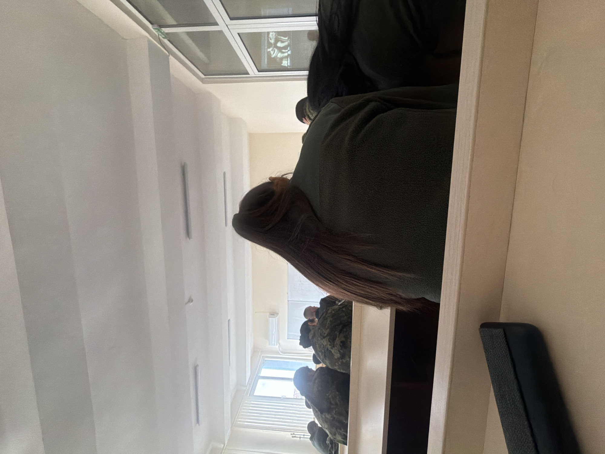 The image depicts an interior view of a classroom or lecture hall located in the city of Dolna Mitropolia, Bulgaria. The perspective is from behind a seated individual, looking towards the front of the room. In the immediate foreground, the upper surface and front edge of a light-colored desk are visible. A dark-colored, rectangular object, possibly a glasses case, rests on the desk surface in the lower left quadrant. Directly in front of the viewpoint, a person is seated, facing away from the camera. This individual has long, dark brown hair tied in a high ponytail and is wearing a dark olive-green fleece or jacket. Further into the midground, multiple individuals, estimated to be between eight and ten, are seated in rows at similar light-colored desks. The majority of these individuals are wearing camouflage pattern jackets, suggesting military uniform or training attire. Their backs are primarily oriented towards the viewer, indicating they are facing the front of the room. Hair lengths vary among these individuals; one subject appears bald, and others have short hair. No discernible actions or interactions are observed between the individuals. The room features light-colored walls and a white ceiling equipped with multiple linear fluorescent light fixtures. A large window fitted with vertical blinds is present on the left wall, providing natural illumination. On the right wall, a large framed glass partition or door is visible, above which a green "EXIT" sign is mounted. A white wall-mounted air conditioning unit is located on the far wall to the left, and a large white board or screen is positioned on the front wall. A circular white object, consistent with a smoke detector, is affixed to the ceiling.