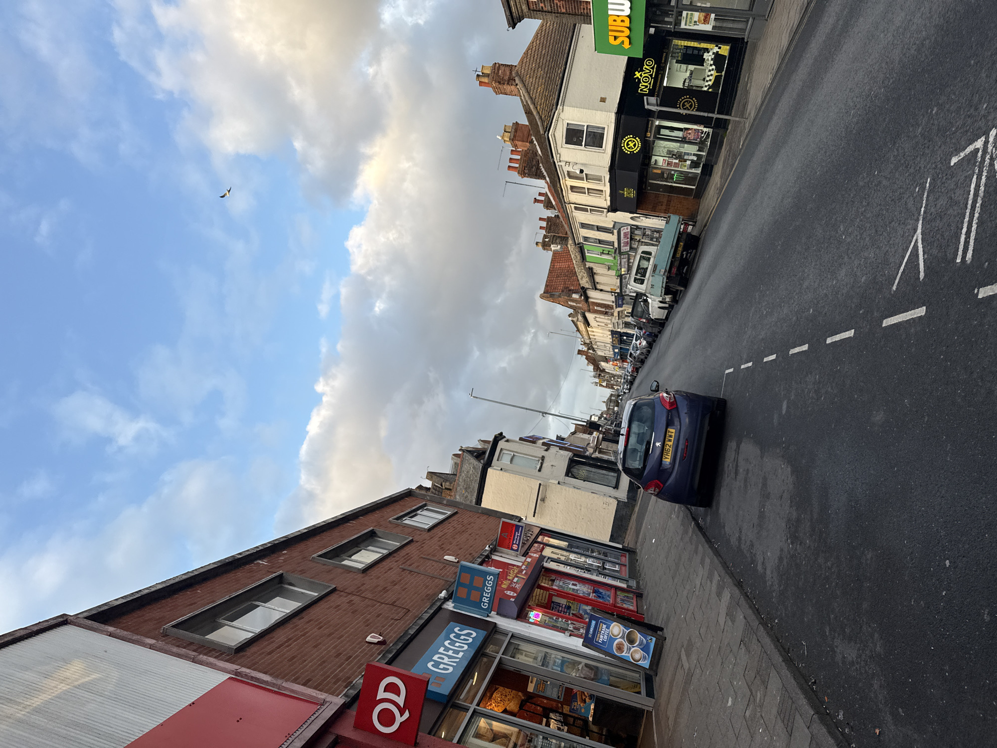 street scene in Gorleston-on-Sea, United Kingdom. The view is taken from the pavement, looking down a street lined with shops and buildings. A blue car, registration number YH62 WWT, is parked on the left side of the road. Several shops are visible, including a Greggs and a Subway. The sky is partly cloudy. There is also a bird in the sky.