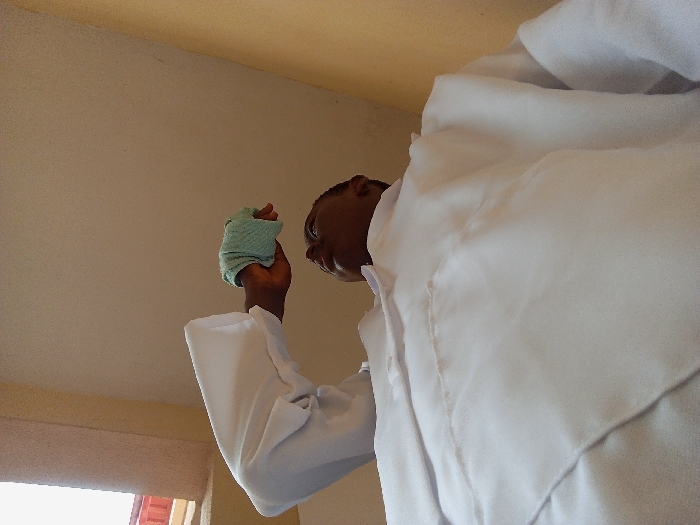 From a low angle, a person wearing a white garment holds a folded green cloth in their raised left hand. The person appears to be looking up. The background features a cream-colored wall, and part of a window is visible in the lower-left corner. The lighting is bright and diffused, creating soft shadows and highlighting the texture of the cloth.