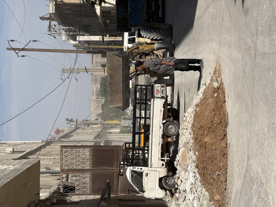 scene in Sbeneh, Syria, at a location with coordinates 33.447 latitude and 36.278 longitude. A white pickup truck is parked on the side of a narrow street. The truck is loaded with a black metal grate. A man in a dark shirt and pants is standing next to the truck, looking at a yellow excavator with a black bucket that is partially obscured by the truck. The excavator is facing forward with its bucket raised in the air. The street is lined with buildings, including a partially destroyed building on the left side of the image. There is a pile of dirt and debris in front of the truck. The scene is lit by the sun, and the sky is blue with a few white clouds. A second vehicle, a white van, is visible behind the truck. A third vehicle, a flatbed truck, is visible behind the excavator. Power lines run above the street, with poles visible in the background.