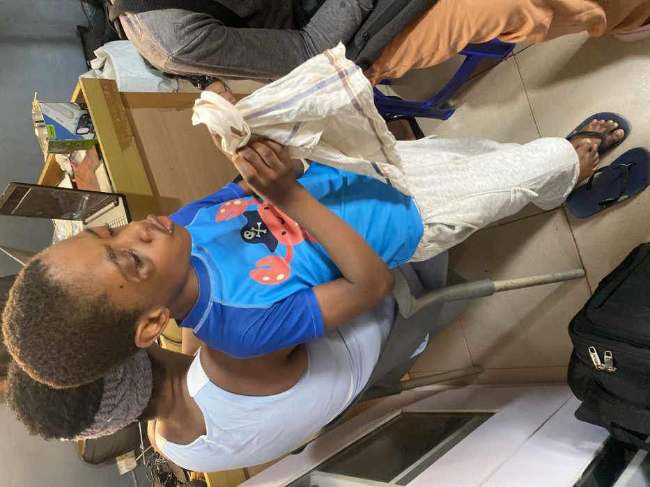 This image, captured in Egan, Nigeria, depicts an indoor scene with a young Black male child and two adults. The child, estimated to be between 5 and 8 years old, stands centrally, facing slightly right. He wears a blue short-sleeved top adorned with a red crab and pirate design, light grey trousers, and blue flip-flops, with one foot partially disengaged from a flip-flop. He holds and manipulates a folded, off-white cloth featuring faint brown and blue stripes. A noticeable dark mark or contusion is present under his left eye. To the child's left, an adult is seated with their back to the camera, wearing a light blue sleeveless top and a grey knitted headband. To the child's right, the lower torso and legs of a second seated adult are visible, dressed in orange-colored trousers. The background includes a light-colored wooden desk bearing an open silver laptop, a white box with blue accents, and other indistinct items. A black soft-sided bag rests on the light-tiled floor in the lower-left quadrant. The overall environment is an illuminated indoor space, possibly an office or communal area.