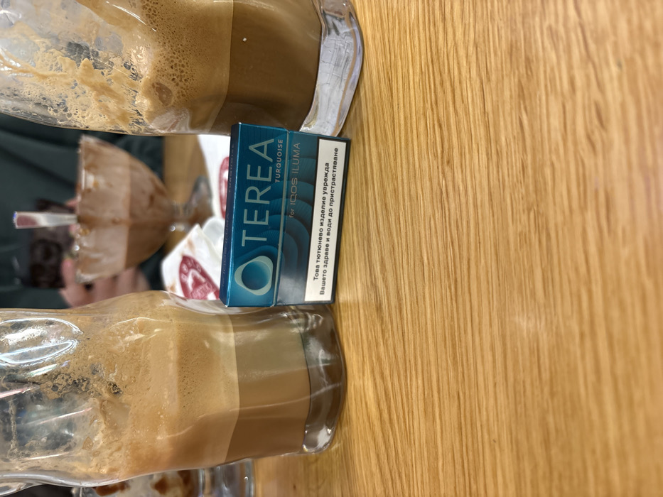The scene is a close-up shot of a wooden table in Plovdiv, Bulgaria. The table surface is light-toned wood with a distinct horizontal grain. In the foreground, a turquoise blue rectangular box, prominently labeled "TEREA TURQUOISE for IQOS ILUMA," is centered. Below the brand name, a health warning in Bulgarian reads: "Това тютюнево изделие уврежда Вашето здраве и води до пристрастяване" (This tobacco product harms your health and leads to addiction). Flanking the TEREA box are two clear glass tumblers, each containing a layered brown beverage with a frothy top, consistent with a coffee or frappe, and a transparent straw. The background is blurred, revealing partial details of individuals and other items. A person on the left, largely obscured, appears to be wearing a dark garment and holding a smartphone or similar device. To the right of the background, a glass dessert bowl containing a brown, possibly chocolate, dessert with a metal spoon inserted is visible, resting on a white napkin bearing a red logo. Vague outlines of hands are discernible behind the dessert.