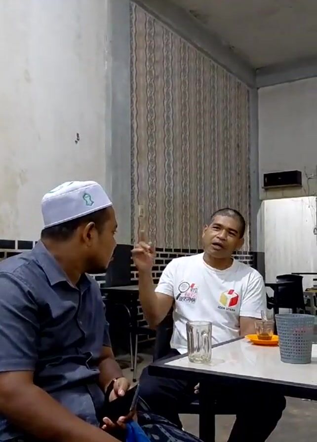 Two men are sitting at a white table in an indoor setting. The man on the left is wearing a dark gray shirt, a patterned sarong, and a white cap with a green design. He is holding a blue bag in his lap. The man on the right is wearing a white t-shirt with red and yellow designs and black pants. A clear glass, a small saucer with a drink, and a gray plastic container sit on the table. The background consists of plain white walls, a decorative wallpaper panel, and black and white brick accents. The setting appears to be a simple, possibly casual, café or gathering place. The two men are looking at each other and appear to be engaged in a conversation.