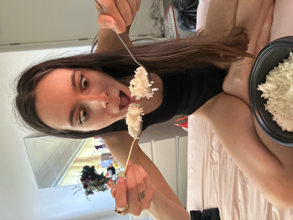 The image displays a young adult female seated on a bed in Corby, United Kingdom. She is wearing a black, possibly one-piece garment, and has long, dark brown hair. Her eyes are wide, and her mouth is open, presenting an exaggerated expression. She holds two silver spoons, each laden with white cooked rice, directly in front of her open mouth. A silver ring is visible on her left ring finger, and a small tattoo is present on the side of her left middle finger. In the immediate foreground, a black pot or bowl containing additional white cooked rice rests on the light pink bedding. The background features a white wall with a rectangular mirror, which reflects a window equipped with vertical blinds. To the left of the subject, a dark vase with artificial flowers and other decorative objects is situated on a white dresser. To the right, a partially visible white object with red text and a black refuse bag are present. The scene is illuminated by natural light, indicating an indoor domestic environment.