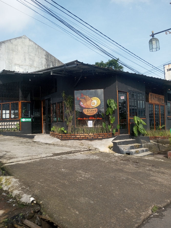 A black-painted building, presumably a restaurant, showcases the name "khaira" on its facade. A sign displays a logo featuring food. The building has dark-framed windows and is partially surrounded by greenery. The street in front appears worn, with visible cracks and patches. Overhead, a network of wires crosses the sky. The sky is a clear blue with some clouds.