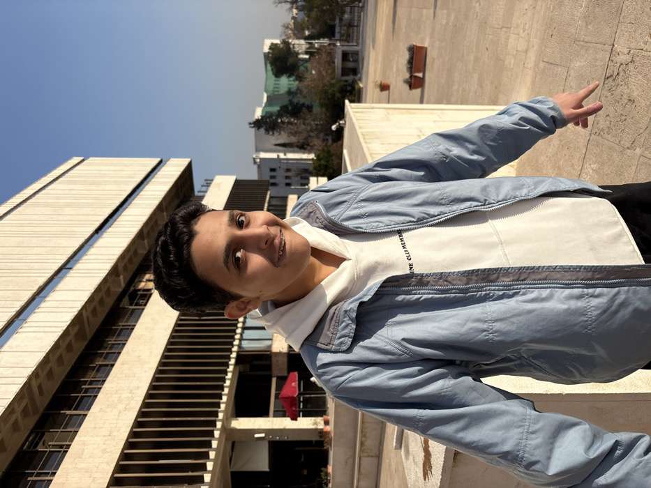 The image depicts an outdoor urban scene in Al-Muhajerin Municipality, Syria, under clear, bright daylight. A young male subject, appearing to be a teenager, stands in the foreground, slightly left of center, facing the viewer with a slight smile. He has short, dark, curly hair and wears dental braces on his upper teeth. He is dressed in a light blue zippered jacket over a white hooded sweatshirt, which displays the partial text "INE CLUB MEMBER" on the chest. Black trousers are visible below the sweatshirt. His right arm is extended downwards and slightly forward, with his index finger pointing towards the ground. In the background, a large, multi-story building with a modern, angular architectural style dominates the left side. It features light-colored, possibly concrete or stone, paneling with distinct vertical louver-like elements on its facade. Dark-framed windows are visible across its levels. A red outdoor umbrella is partially visible on a lower patio area of this building. To the right and further in the distance, additional urban buildings, including one with prominent green and white sections, are partially obscured by scattered deciduous trees. The subject stands on a light-colored paved surface, possibly a terrace or plaza. A low, light-colored stone wall or railing extends across the mid-ground. Two terracotta-colored planters containing small green plants are situated on this wall to the right of the subject. The sky is clear blue.