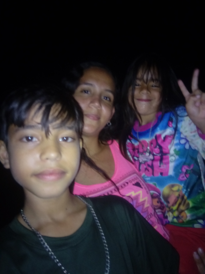 A selfie shows a young boy with a dark green shirt and silver chain in the foreground. Behind him is a woman in a hot pink tank top. To her right, a younger girl in a colorful shirt flashes a peace sign. They are positioned closely together, and the background is completely dark. The image is slightly blurry, suggesting low lighting conditions.