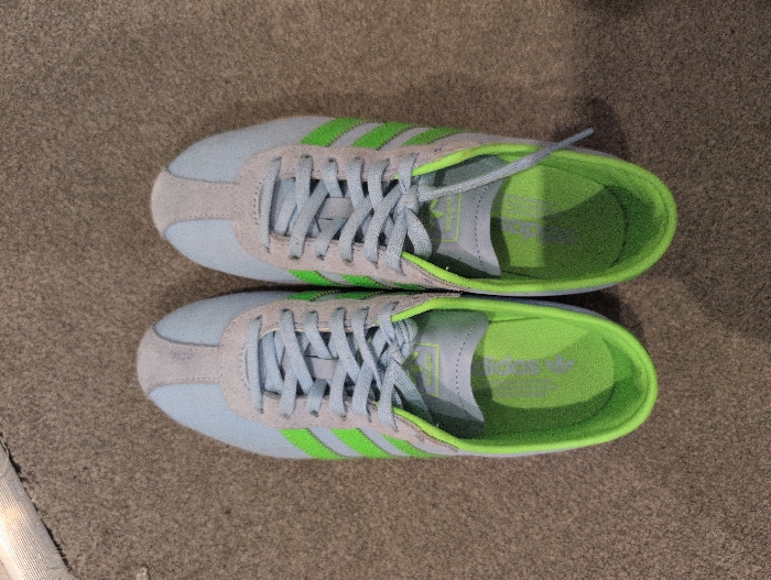 - "A pair of light blue Adidas sneakers with lime green stripes and lining sit on a gray surface" by FM-toJkf1, licensed under CC BY 4.0