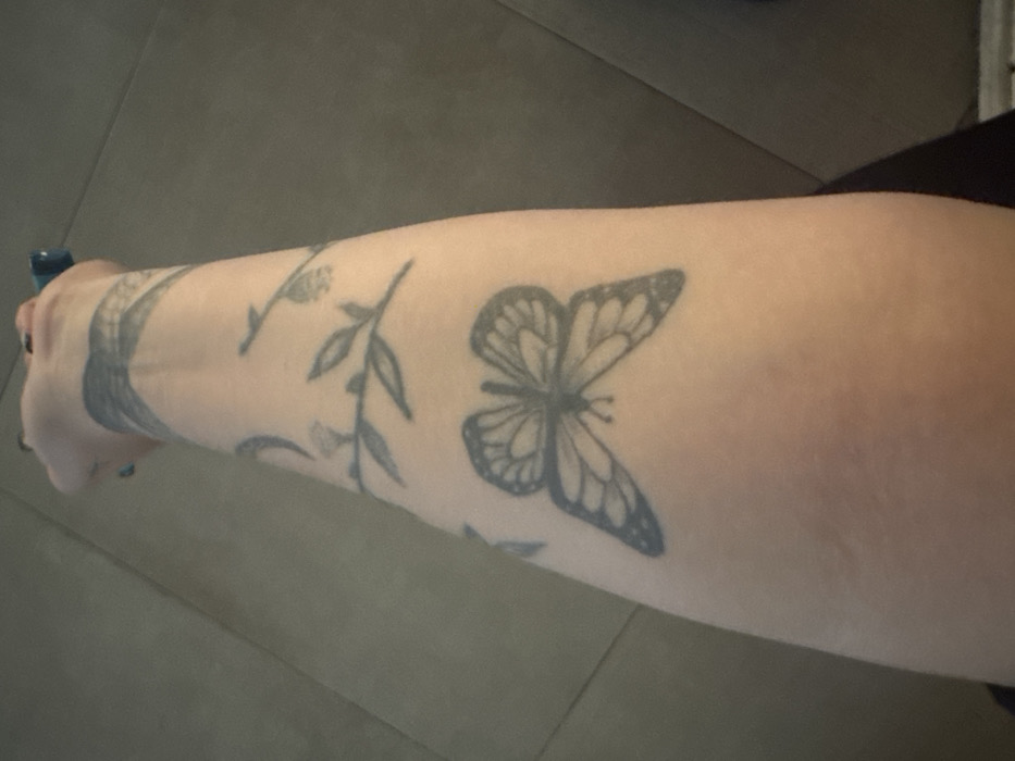 This image depicts a light-skinned human forearm, held vertically, against a light grey, featureless background, identified as being in the city of Velebi, Georgia. The forearm is extensively tattooed with dark ink designs. A prominent butterfly tattoo with open, detailed wings is situated on the lower portion of the forearm. Above this, a botanical design featuring a stem with leaves and small buds or flowers extends further up the arm. Near the wrist, a band-like tattoo with a pattern is visible. A portion of a hand is at the top of the image, with dark-painted fingernails, grasping a small, blue, cylindrical object. The subject's arm is stable, indicating either a deliberate pose or a static position. No other individuals or significant objects are present in the visible environment.