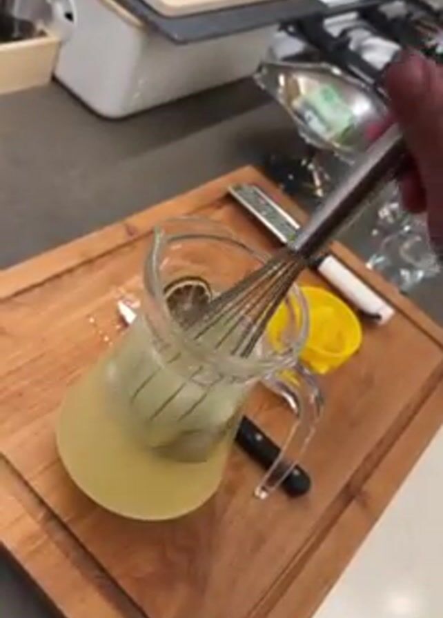 person making a beverage in a glass pitcher. The pitcher contains a yellow liquid, ice, and several slices of what appear to be limes. A whisk is used to stir the contents of the pitcher. The pitcher is placed on a wooden cutting board which also holds a small knife and a yellow citrus juicer. The setting appears to be a kitchen counter.