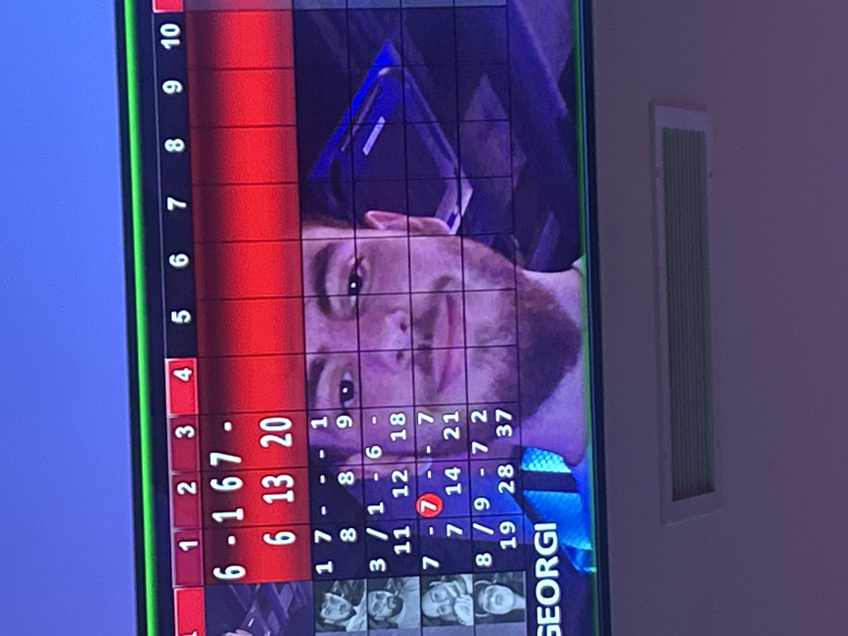 This image displays a digital bowling score screen within an indoor commercial establishment, identified as a bowling alley in Sofia, Bulgaria. The screen features a scoreboard with frames 1 through 10 arranged horizontally at the top. On the left margin, a vertical column contains small circular profile images or avatars representing players, with the name "GEORGI" visible for one participant. Numerical scores for individual frames and cumulative totals are displayed. For example, Georgi's scores are 19, 28, and 37 for frames 1-4, with a score of 7 circled in red in frame 3. The right two-thirds of the screen are overlaid by a semi-transparent image of a young adult male with a beard, smiling faintly. To the right of the male's image, a blurred background with blue and dark hues suggests a bowling lane or machinery. A thin green border frames the top and left edges of the screen. Below the screen, a segment of a light-colored ceiling with a rectangular ventilation grate is visible.