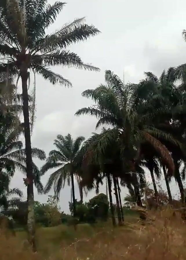 view of several tall palm trees against a cloudy sky. The trees are the main focus, with their green fronds prominently displayed. Below the trees, there is dry, brown grass. The camera appears to be moving slightly.