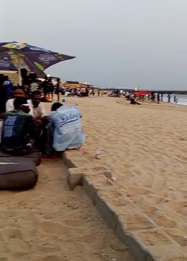 beach with light-colored sand under an overcast sky. The ocean is in the background, with a wave break visible in the distance. Several people are present: some are sitting and talking under an umbrella, while others are walking or standing on the beach. A low concrete barrier is in the foreground.