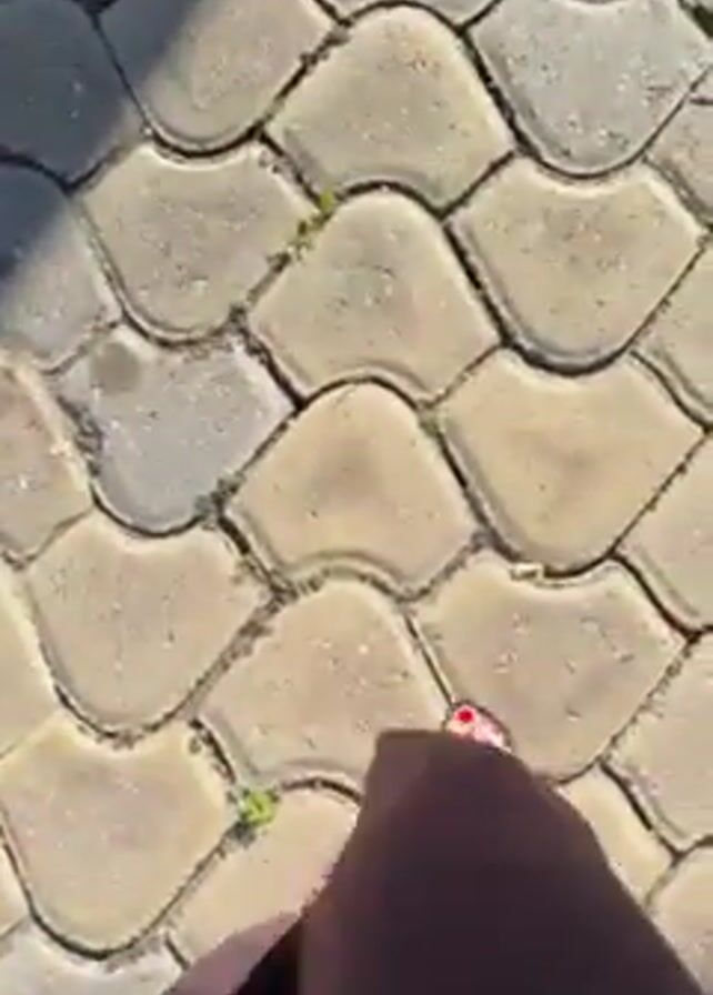 person walking on a paved surface. The paving is made of interlocking, fan-shaped stones in alternating colors of gray and beige. The person is wearing sandals and has red nail polish on their toes. The camera is positioned looking down at the person's feet as they walk. Shadows are visible on the pavement. Towards the end of the video, the paving transitions to a section made of small, gray river stones.