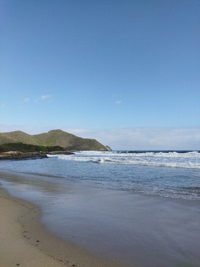 A serene beach scene unfolds under a vast blue sky dotted with faint clouds. Gentle waves roll towards the sandy shore. A rugged, green mountain range dominates the backdrop, contrasting with the lighter blue of the water. Rocky outcroppings edge the coastline, adding texture to the tranquil seascape. The light reflects on the wet sand, creating a shimmering effect.