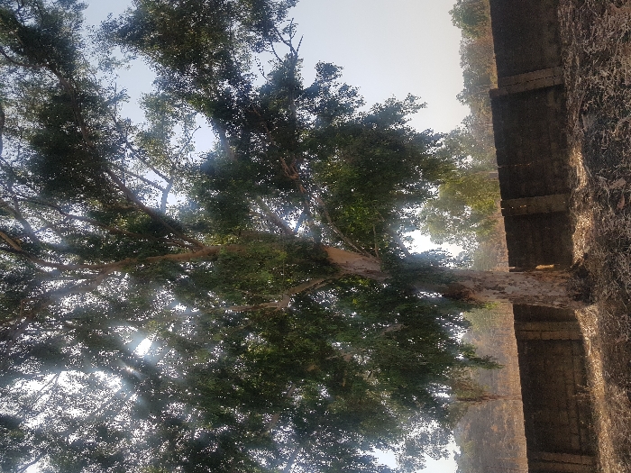 The image depicts an outdoor scene in Bukuru, Nigeria, primarily featuring a large tree. A tall, light-barked tree, possibly a Eucalyptus, with dense green foliage, occupies the central and upper portions of the frame. Its trunk is situated at the bottom center. Bright sunlight filters through the tree's canopy from the upper left, creating visible sunrays and lens flare. Behind the tree, a dark grey concrete block wall, approximately 1.5 meters high, spans horizontally across the midground. The ground in the foreground is dry, unpaved earth, covered with scattered dry leaves and sparse brown vegetation. Beyond the wall, a parched, brown hillside or mountain range is visible to the left, while other green-leafed trees appear in the distance to the right, beneath a clear, light blue sky. No individuals or animals are present, and no specific actions or interactions are occurring.
