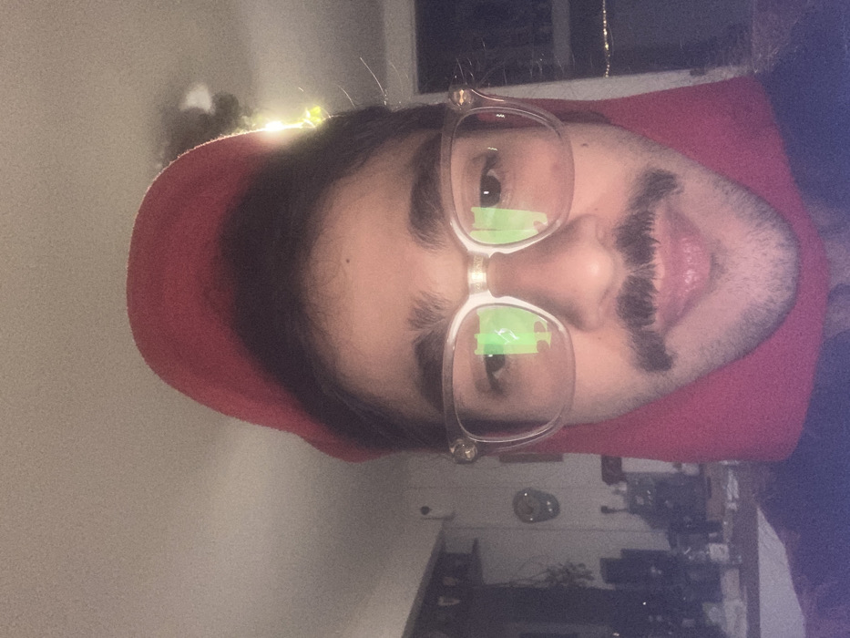 A person wearing a red hat and glasses looks into the camera. A fake, dark mustache is positioned above the person's upper lip. Reflections are visible in the lenses of the glasses. The person is indoors, with a glimpse of a room visible in the background. The image is slightly angled, and the lighting is somewhat dim.