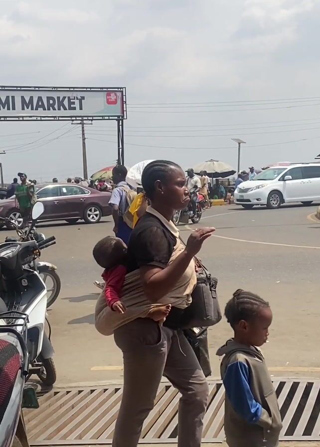busy street scene in front of "OMI MARKET," as indicated by the sign. The street is crowded with pedestrians, motorcycles, and auto rickshaws (tuk-tuks). People are crossing the street and walking around. One woman is carrying a baby in a sling, with another child walking beside her. Another woman is walking with a large plastic bag balanced on her head. There's a general sense of activity and movement typical of a market area. The sky is overcast.