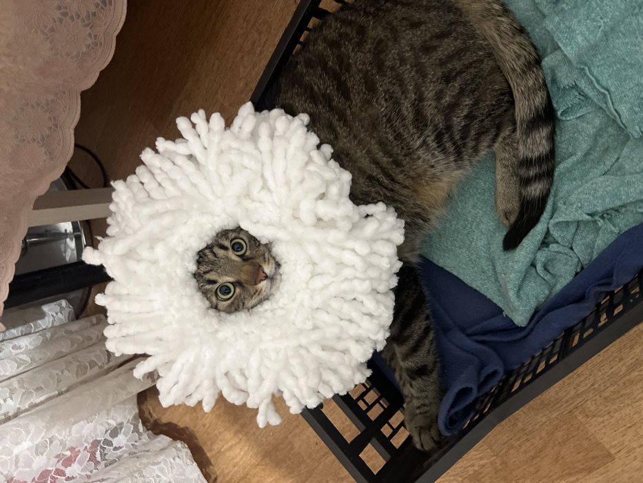 The indoor scene is located in Strasbourg, France. A tabby domestic cat is positioned inside a black plastic laundry basket, resting on crumpled textiles in dark blue and teal. The cat's head is encircled by a circular, white, shaggy microfiber mop head, forming a ruff-like adornment. Its eyes are wide open with dilated pupils, fixed forward. Its striped tabby fur body is largely contained within the basket, with one front paw visible resting on the blue fabric and its striped tail curled on the teal fabric. The surrounding floor is light-colored wood. In the background, white lace curtains are partially visible to the upper left. To the upper right, a white furniture leg and a pink scalloped fabric suggest nearby furniture.