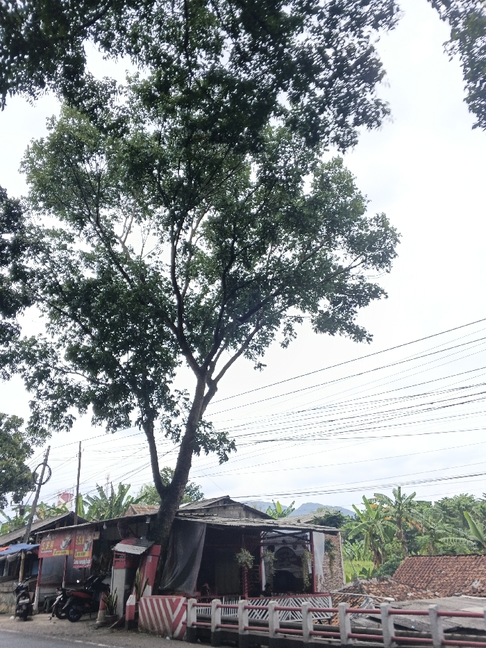 A tree with a dense canopy dominates the frame, its trunk nestled against a structure. The structure appears to be a roadside business with an awning and a red and white barrier in front. Several motorcycles are parked nearby. Power lines crisscross the sky above. In the background, a lush, green landscape includes banana trees and glimpses of mountains under a cloudy sky.