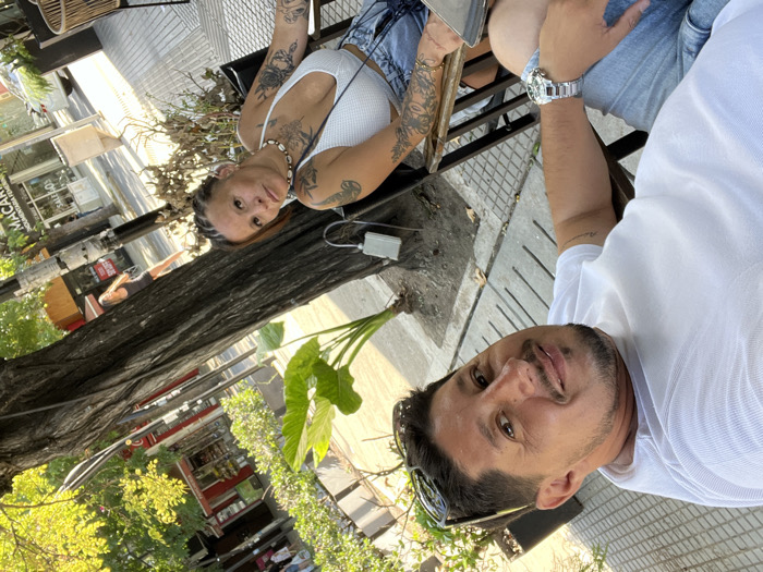 Two individuals are depicted in an outdoor setting in City Bell, Argentina. A male subject occupies the left foreground, presenting light skin, short dark hair, and stubble. He wears a white t-shirt, light shorts, and a silver wristwatch on his left wrist, with sunglasses resting on his head. He smiles directly at the camera. To his right, a female subject, also with light skin, has braided hair and multiple tattoos visible on her arms and chest. She wears a white halter top, denim shorts, and a shell necklace, looking towards the camera with a neutral expression. Both are seated in dark-colored metal chairs on a paved sidewalk. A large tree with green foliage stands between the subjects and the background, where a street, partial vehicles, and commercial buildings with visible signage, including "MACAR...", are present under natural daylight.
