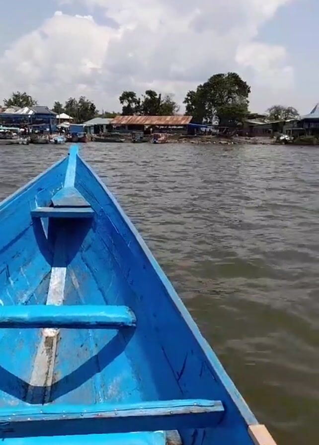 view from the bow of a small, bright blue boat moving through the water. The camera is stable and focused on the buildings on the distant shore. The water has gentle ripples and a slightly murky color. The sky is partly cloudy with a bright, sunny feel. Several buildings are visible on the shore, including some elevated on piers. Other boats are also visible near the shore. The video appears to be taken during the daytime.