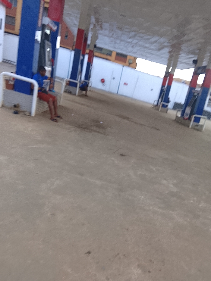 This image depicts a gas station forecourt in Onitsha, Nigeria. The specific location within the city cannot be determined from the visual evidence. The scene features a concrete ground surface beneath a white canopy supported by multiple pillars, primarily striped blue and red with white bases. Several fuel pumps, similarly colored blue and red with white bases, are positioned under this canopy. On the left side of the frame, a single individual is seated on a low white concrete barrier adjacent to a fuel pump. This person wears a blue short-sleeved shirt, red shorts, and dark flip-flops, holding a light-colored rectangular object, potentially a mobile device or a small book. In the background, a white perimeter wall is visible, with a red fire hose reel mounted on it. An orange-brown building is partially discernible above and behind this wall. The forecourt is largely devoid of vehicles and other individuals, with minor debris scattered on the concrete surface. No interactions between people are observed.