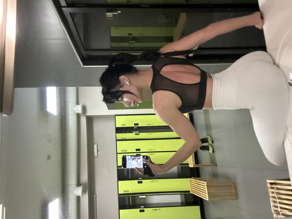 A woman takes a selfie in a locker room. She is wearing a black sports bra and white leggings. Her hair is pulled back in a ponytail. She is holding her phone in her left hand. The lockers are green and have black numbers. There are wooden benches in the room.