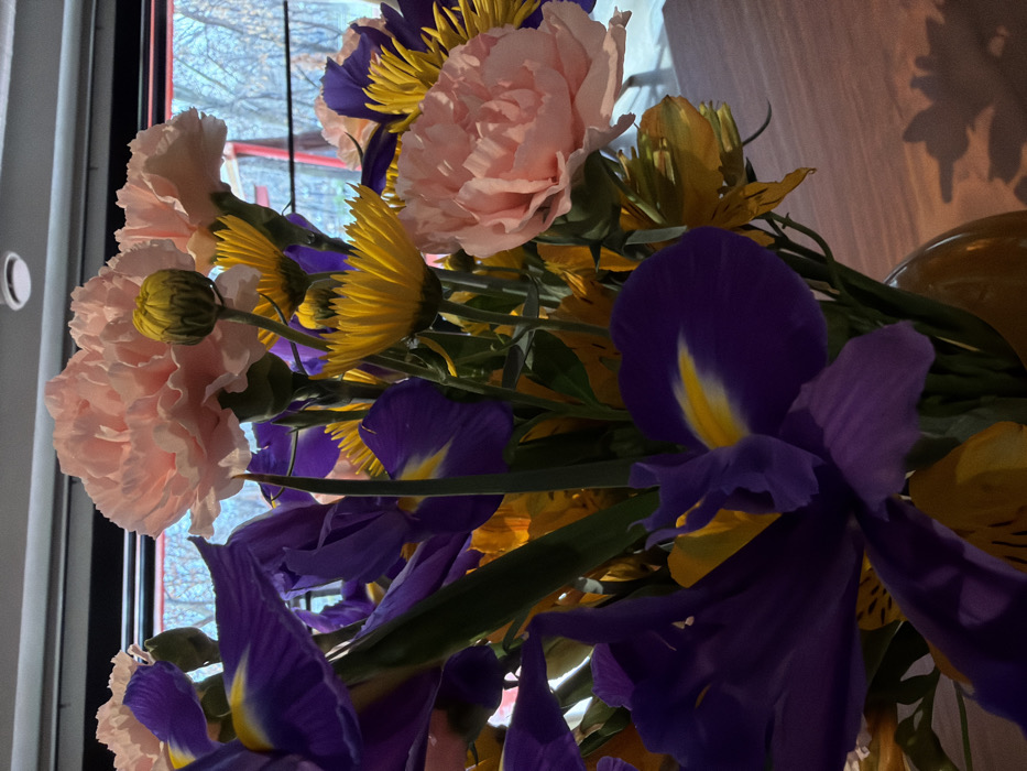 The image captures a close-up, indoor view of a vibrant floral bouquet. The arrangement predominantly features several large pink carnations, multiple deep purple irises with distinct yellow and white centers, and numerous smaller yellow daisy-like flowers, interspersed with additional yellow-orange blooms. A single green, unopened flower bud is visible among the pink carnations. The flowers are held within an orange-hued vase, partially visible at the bottom of the frame. The bouquet is situated on a light brown wooden surface, where a soft shadow from the flowers is cast on the lower right. In the background, a large window reveals an outdoor scene with numerous bare tree branches against a bright, hazy sky, suggesting a natural or park-like setting during late winter or early spring. Reflections of an overhead light fixture are visible on the window's upper portion. The specific location within Yerevan, Armenia, cannot be determined from the visual information present in the image.