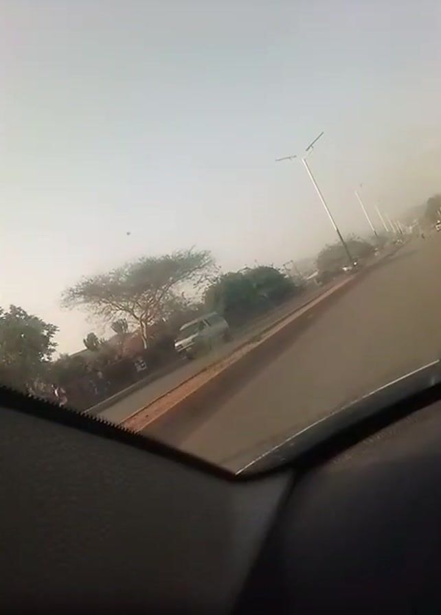 A car is driving on a road on a misty day. The road has a raised median with trees, bushes, and lampposts. There are people walking on the median. Other cars are visible in the distance. The view is from inside the car, looking out the front window.