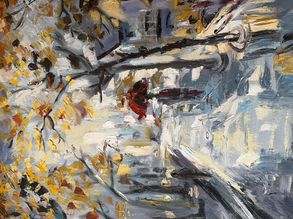 The image is an oil painting executed with heavy impasto, portraying an autumn street scene during rainfall