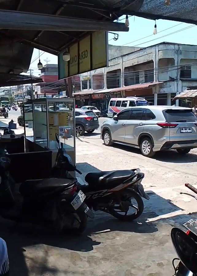 The camera is positioned under a shaded awning, looking out onto a street with parked motorcycles and cars. The buildings lining the street appear to be two or three stories tall. Traffic moves in both directions. A yellow truck drives across the frame. A person on a motorcycle wearing a headscarf can be seen driving by. The sky is bright blue.