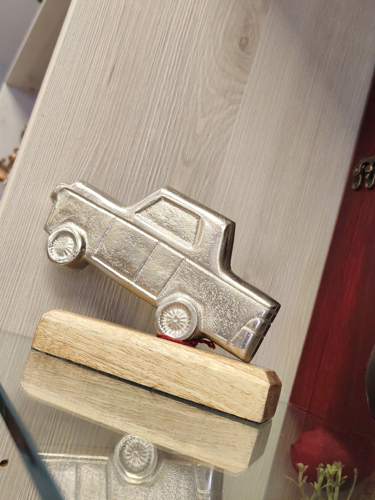A silver, vintage car-shaped object rests atop a rectangular, light-wood block on a glass surface