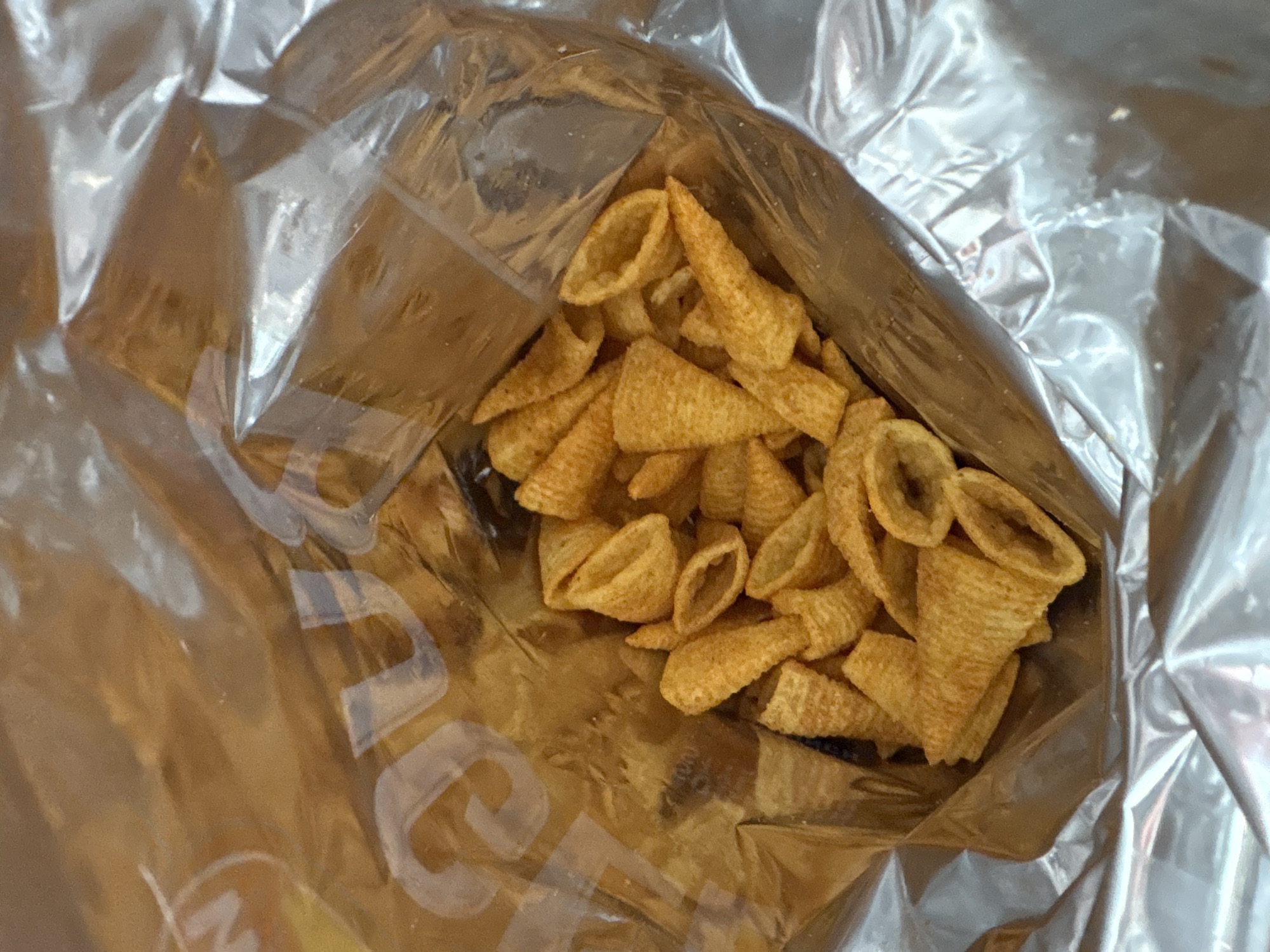 - "The image displays a close-up, top-down view into an open, crinkled snack bag containing numerous orange-yellow, cone-shaped corn snacks" by FM-HUQ9D3, licensed under CC BY 4.0